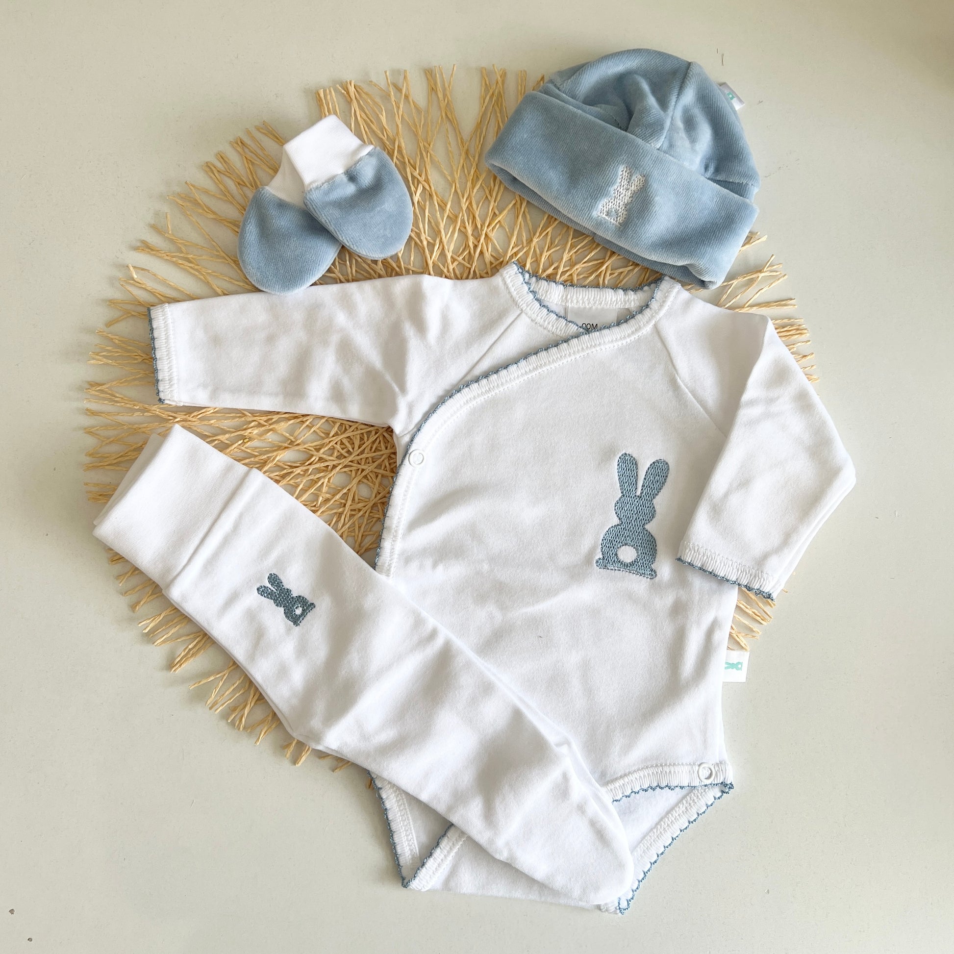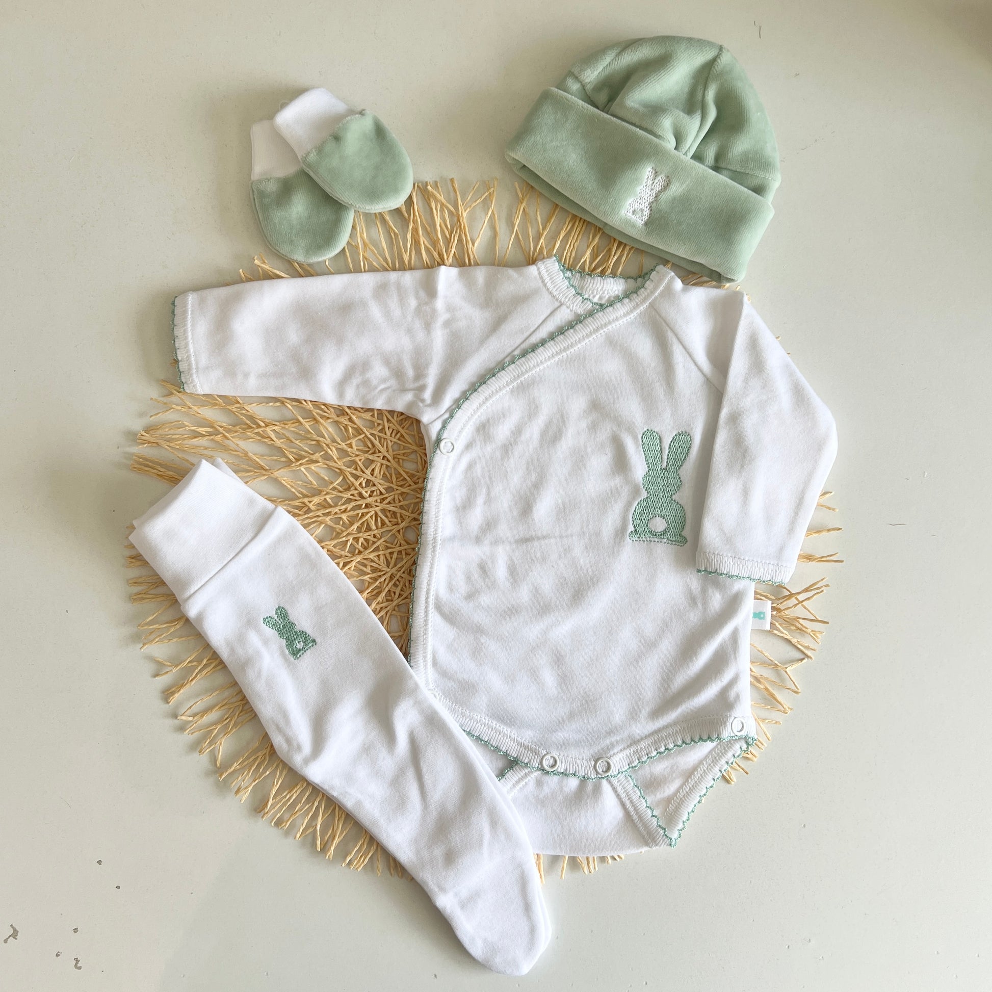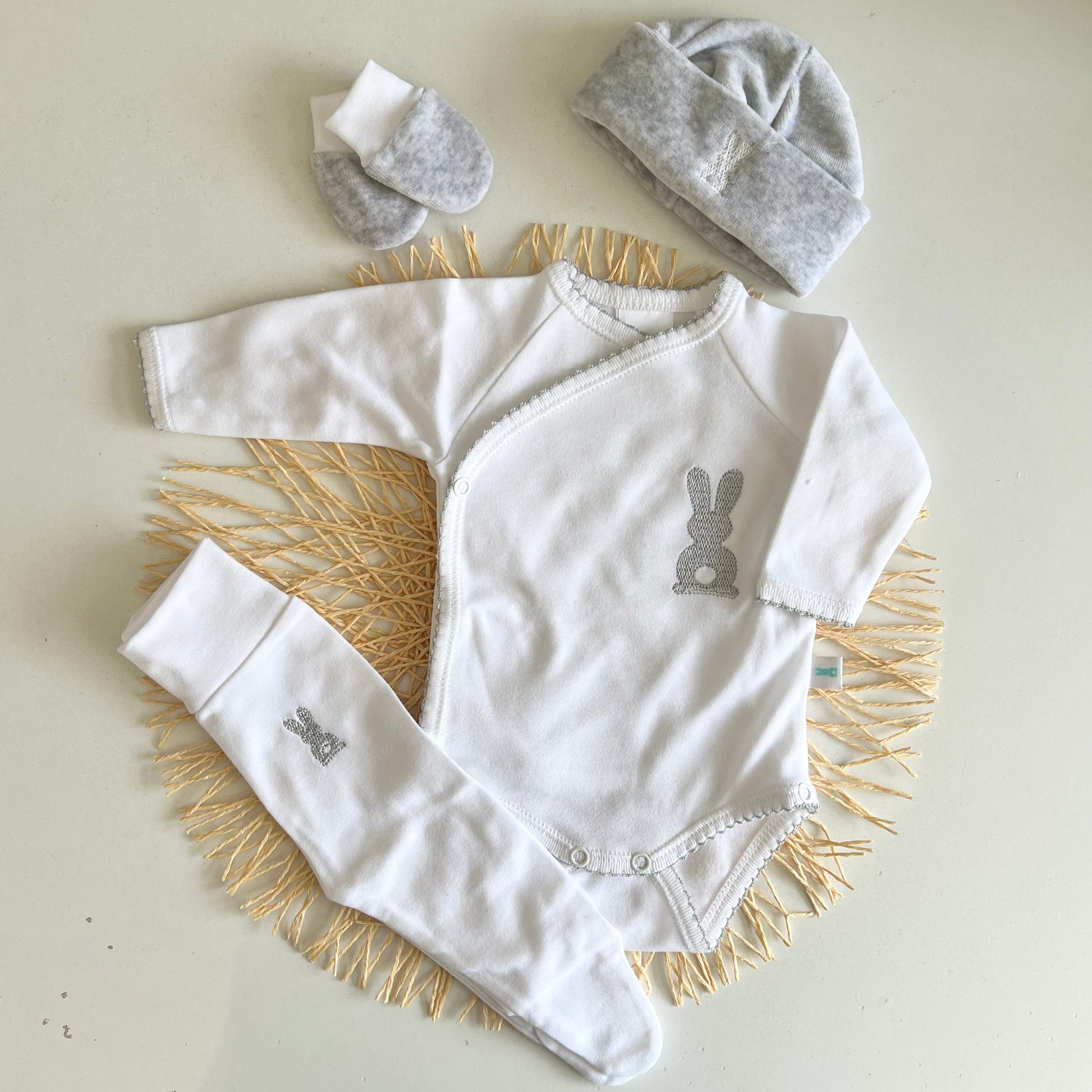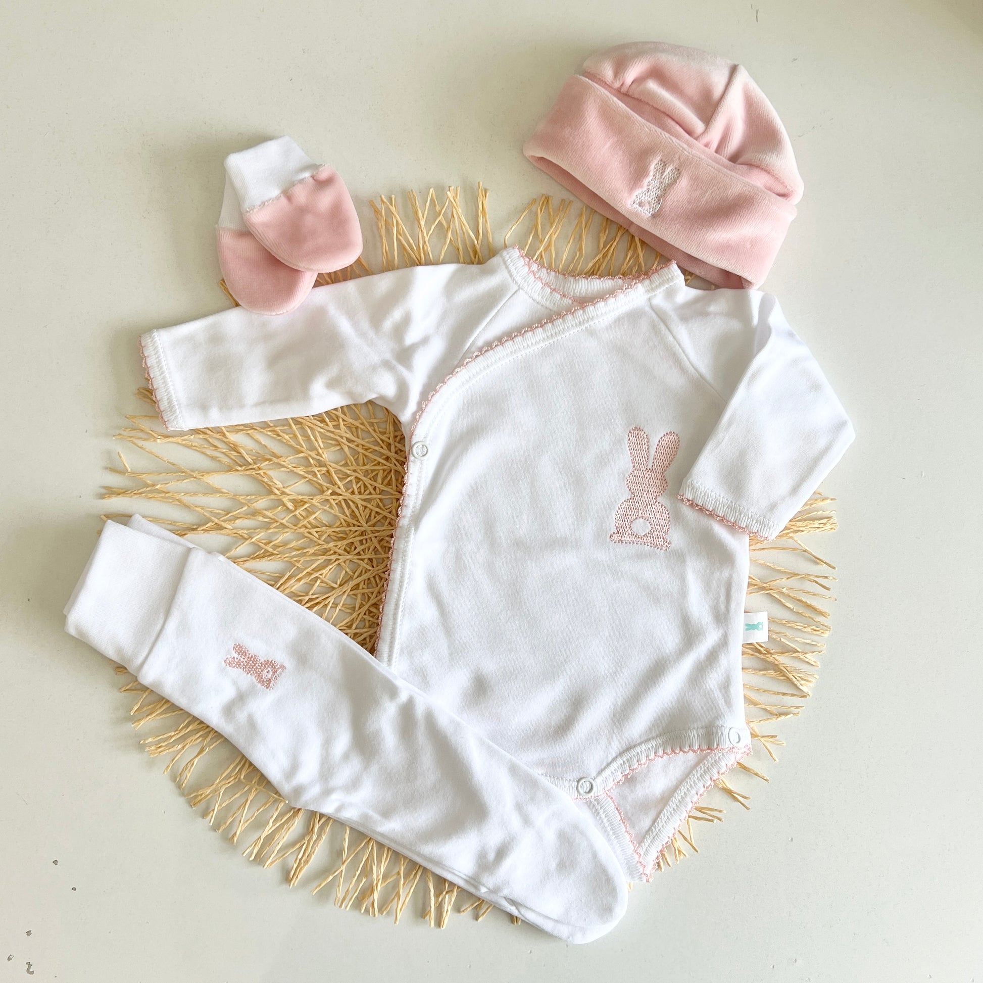 Conjunto de roupinha para recém nascido. Inclui um body de algodão traçado, para facilitar na hora de vestir e despir o bebé, calcinhas, gorro e luvinhas em veludo. O conjunto perfeito e lindo para levar para a maternidade.