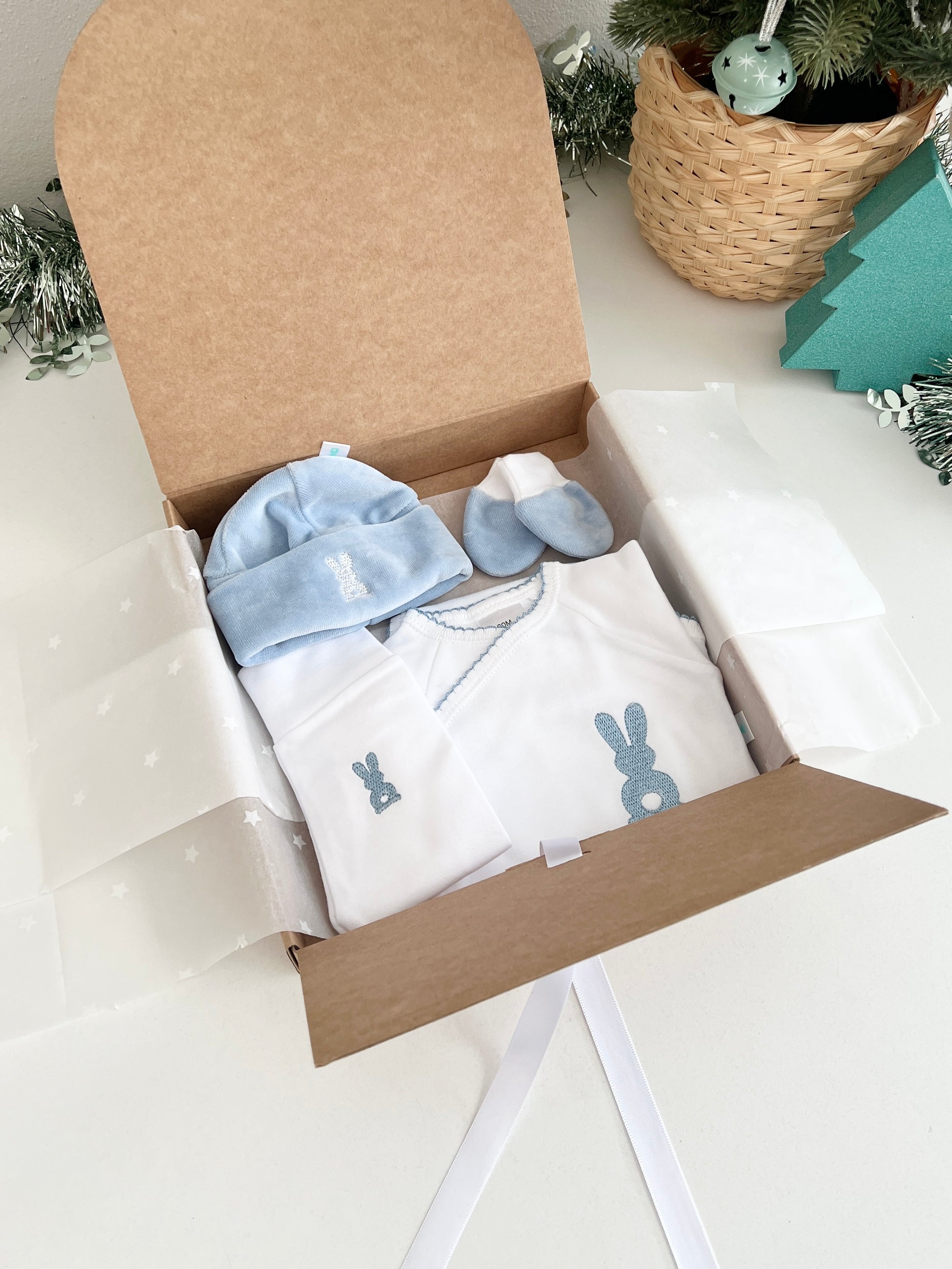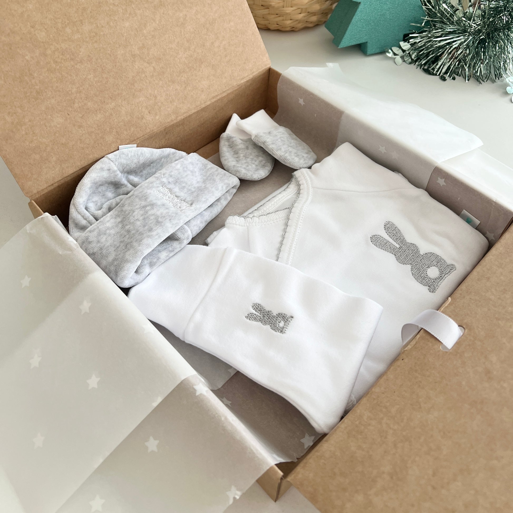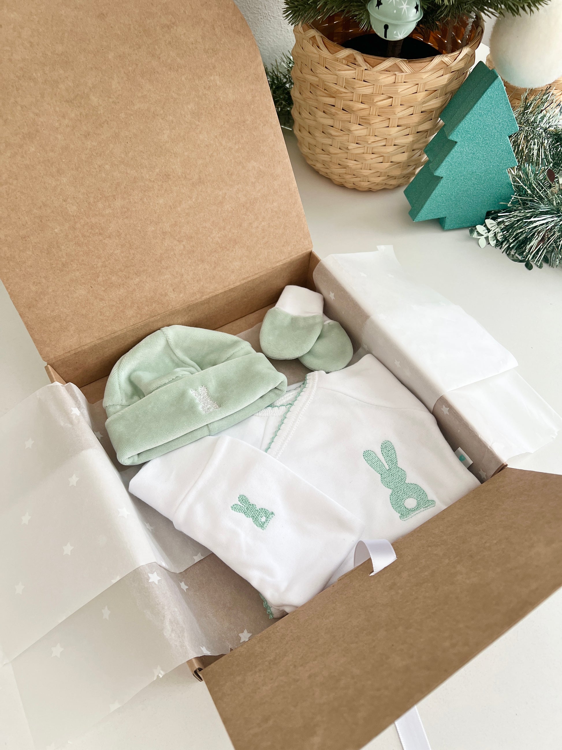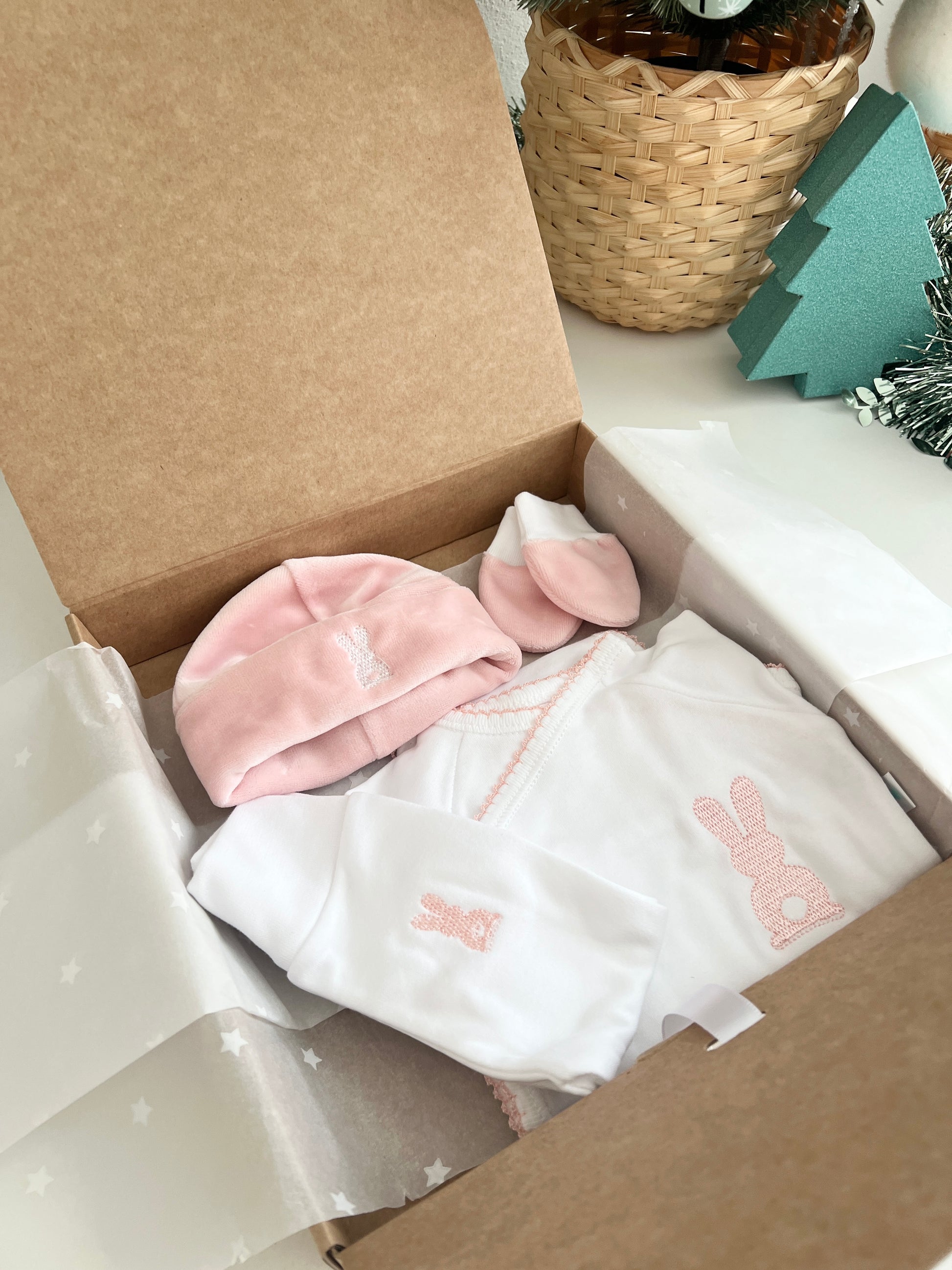 Conjunto de roupinha para recém nascido. Inclui um body de algodão traçado, para facilitar na hora de vestir e despir o bebé, calcinhas, gorro e luvinhas em veludo. O conjunto perfeito e lindo para levar para a maternidade.