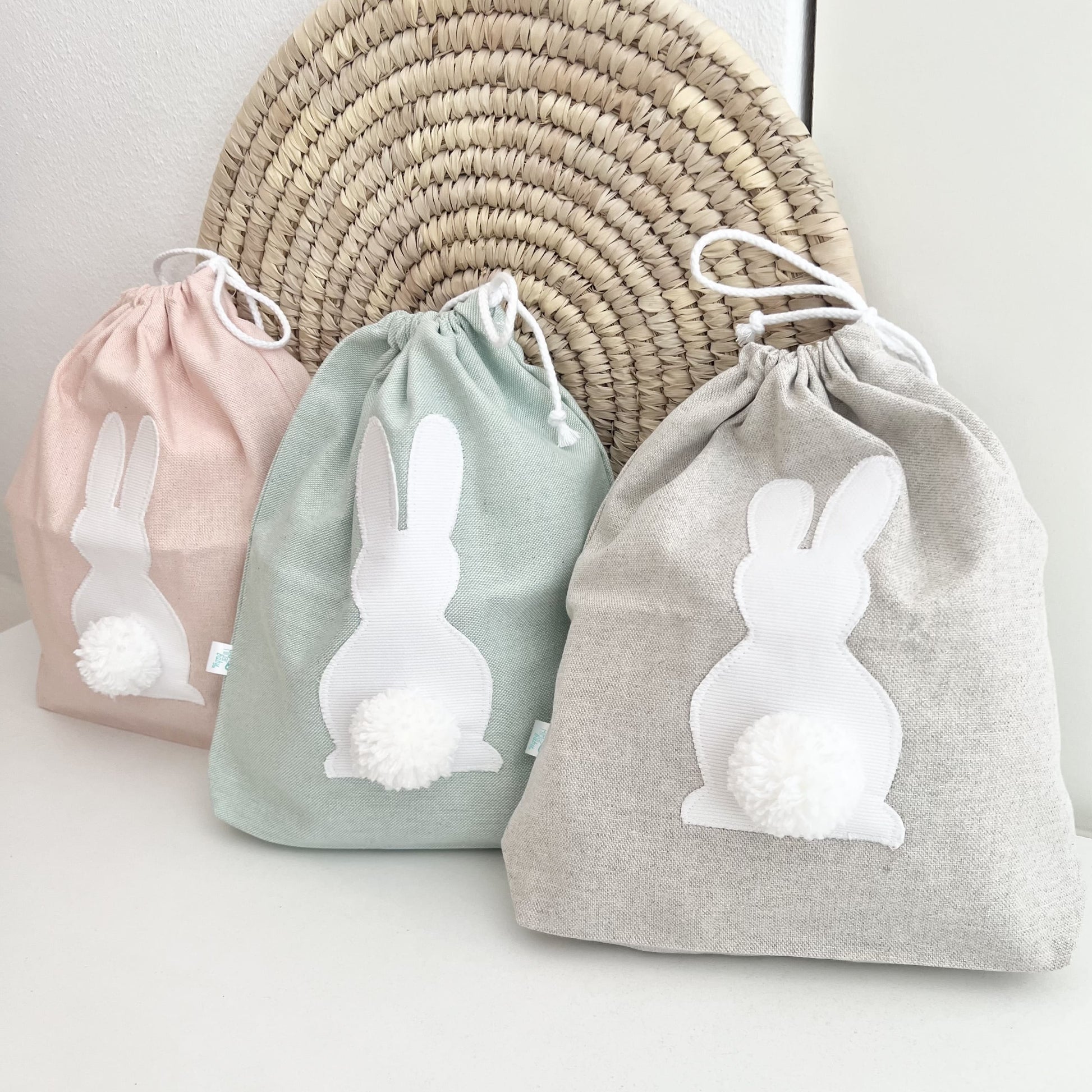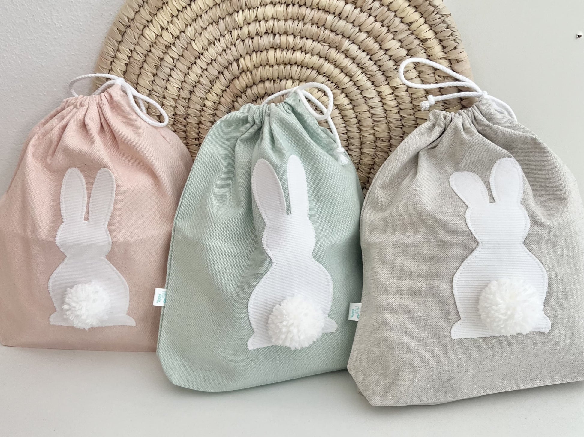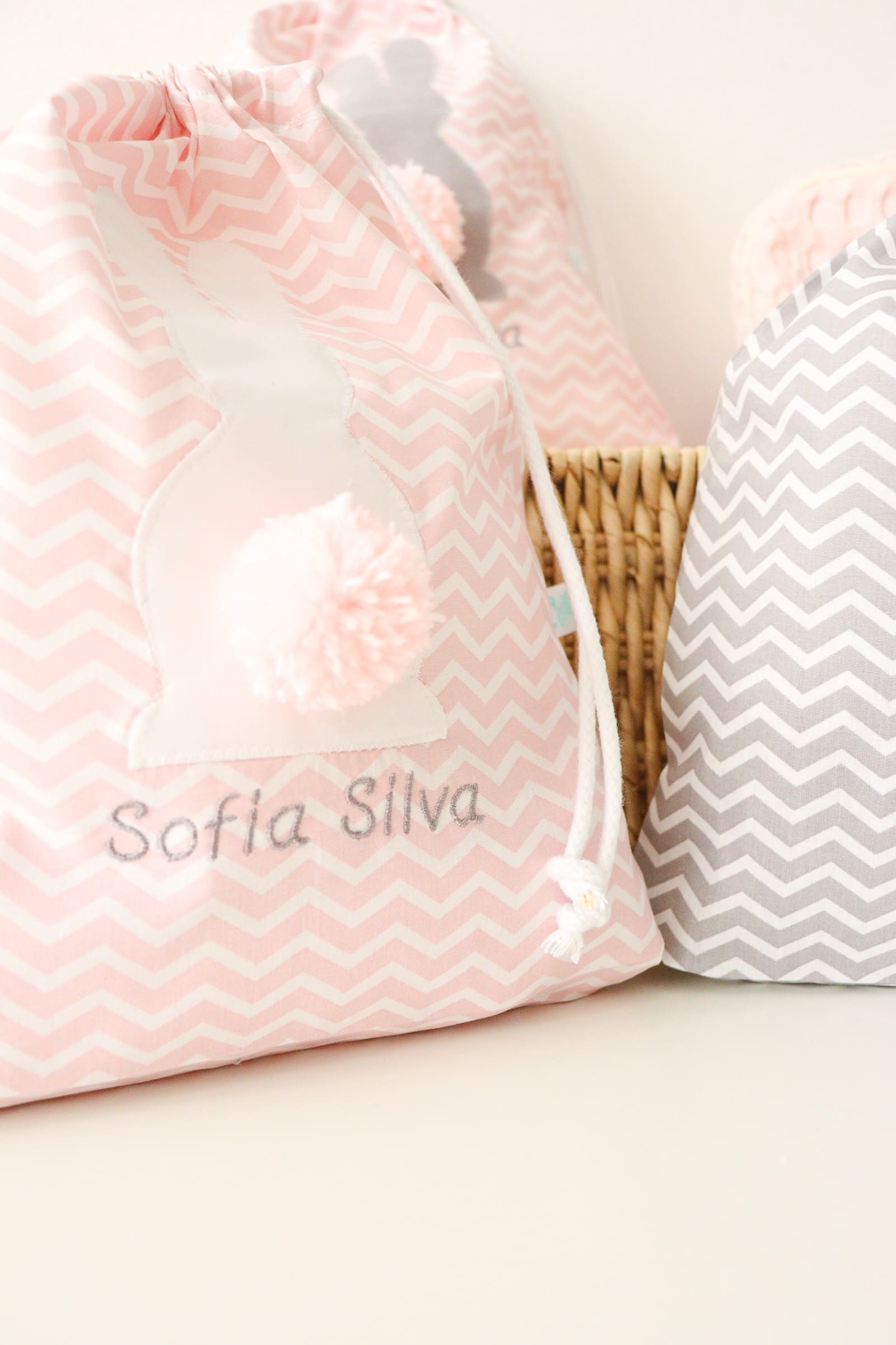 Os Sacos Coelhinho são ideais para separar as mudas de roupa do seu bebé e levar na sua mala da maternidade. Mas podem servir para várias outras funções. Em tecido de algodão estampado.