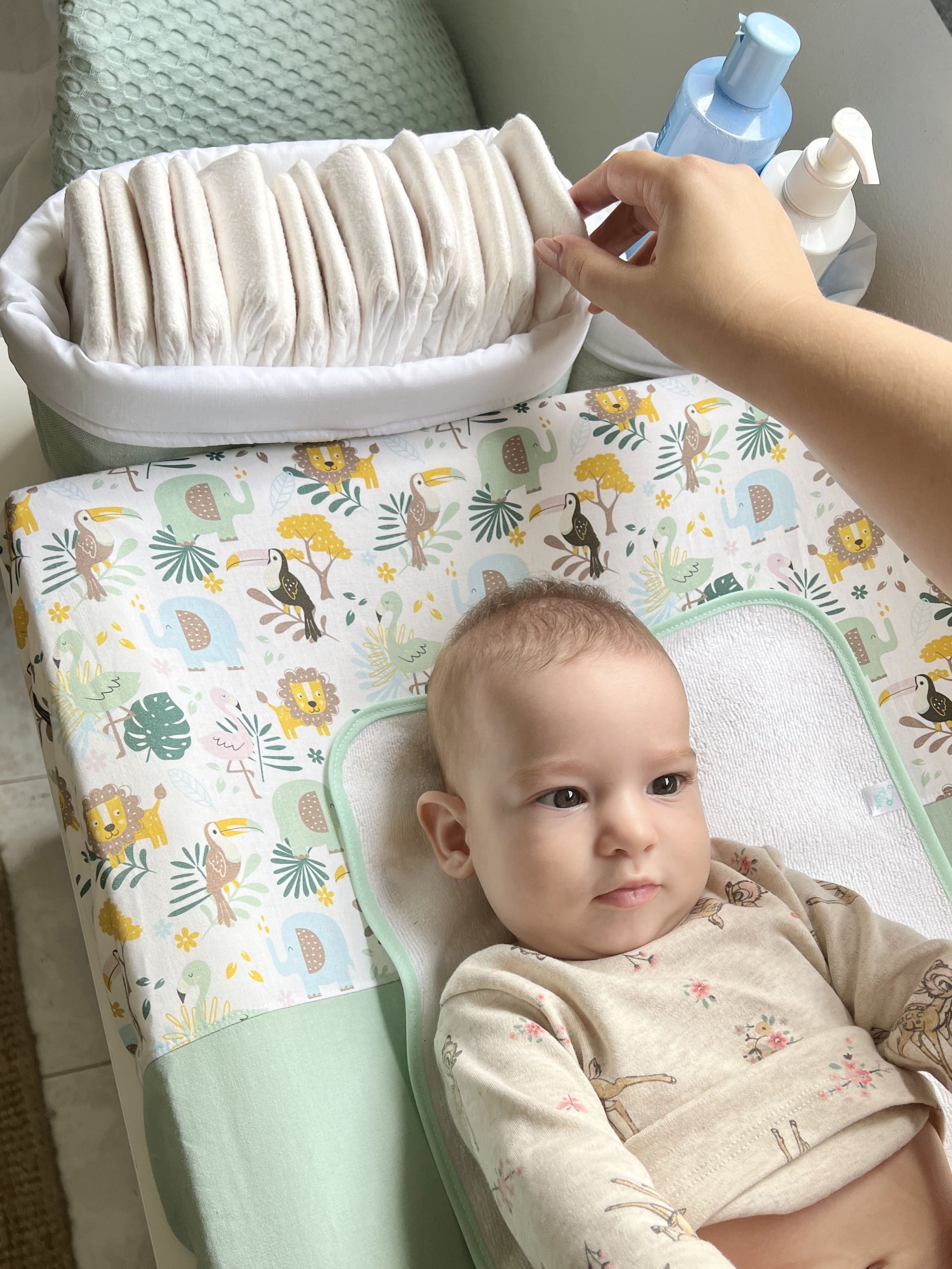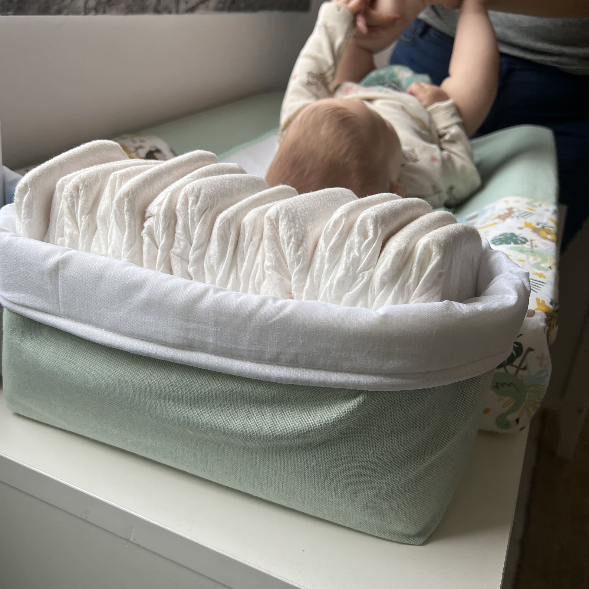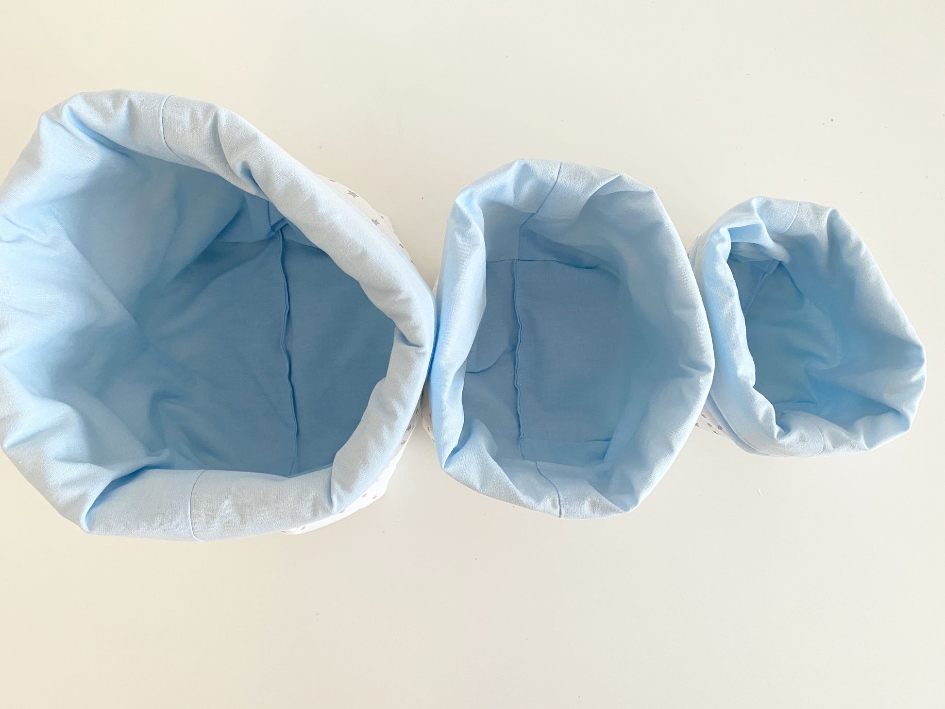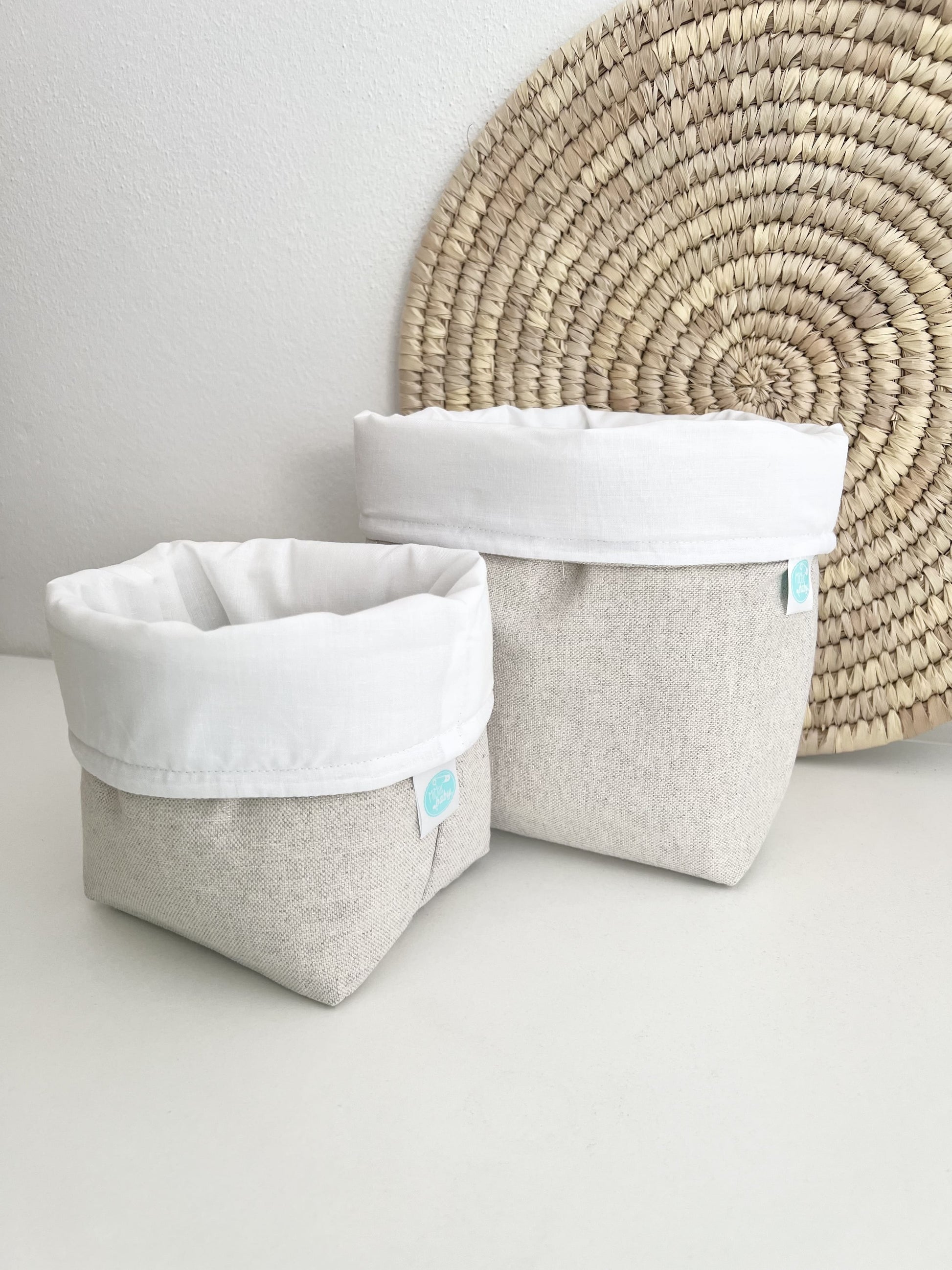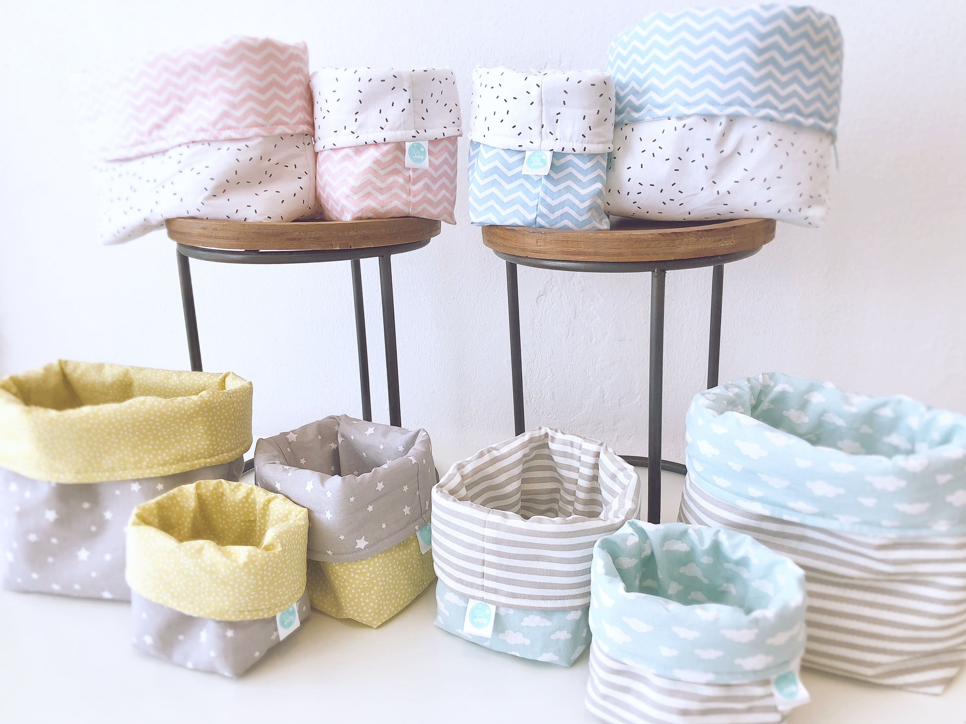Cestas reversibles en tejidos de algodón estampados, ideales para tener a mano los productos de tu bebé. Ayuda a organizar la habitación del bebé.