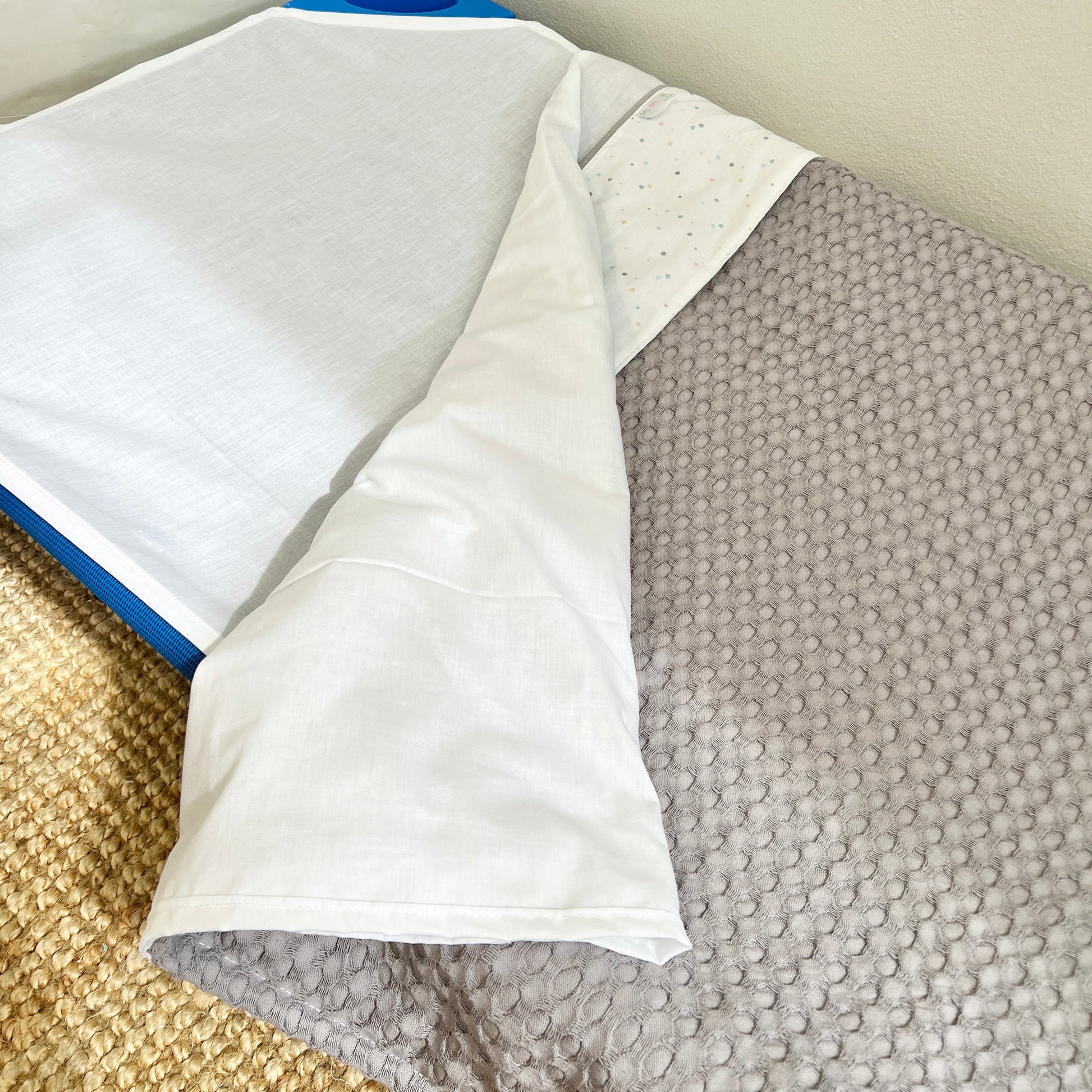 Manta acolchoada, feita à medida da caminha CATRE (135x0,58cm), utilizada pela maioria dos infantários. Com elásticos em baixo para se adaptar à caminha e não cair e com botões laterais para prender no lençol e ficar mais seguro e confortável para o bebé.